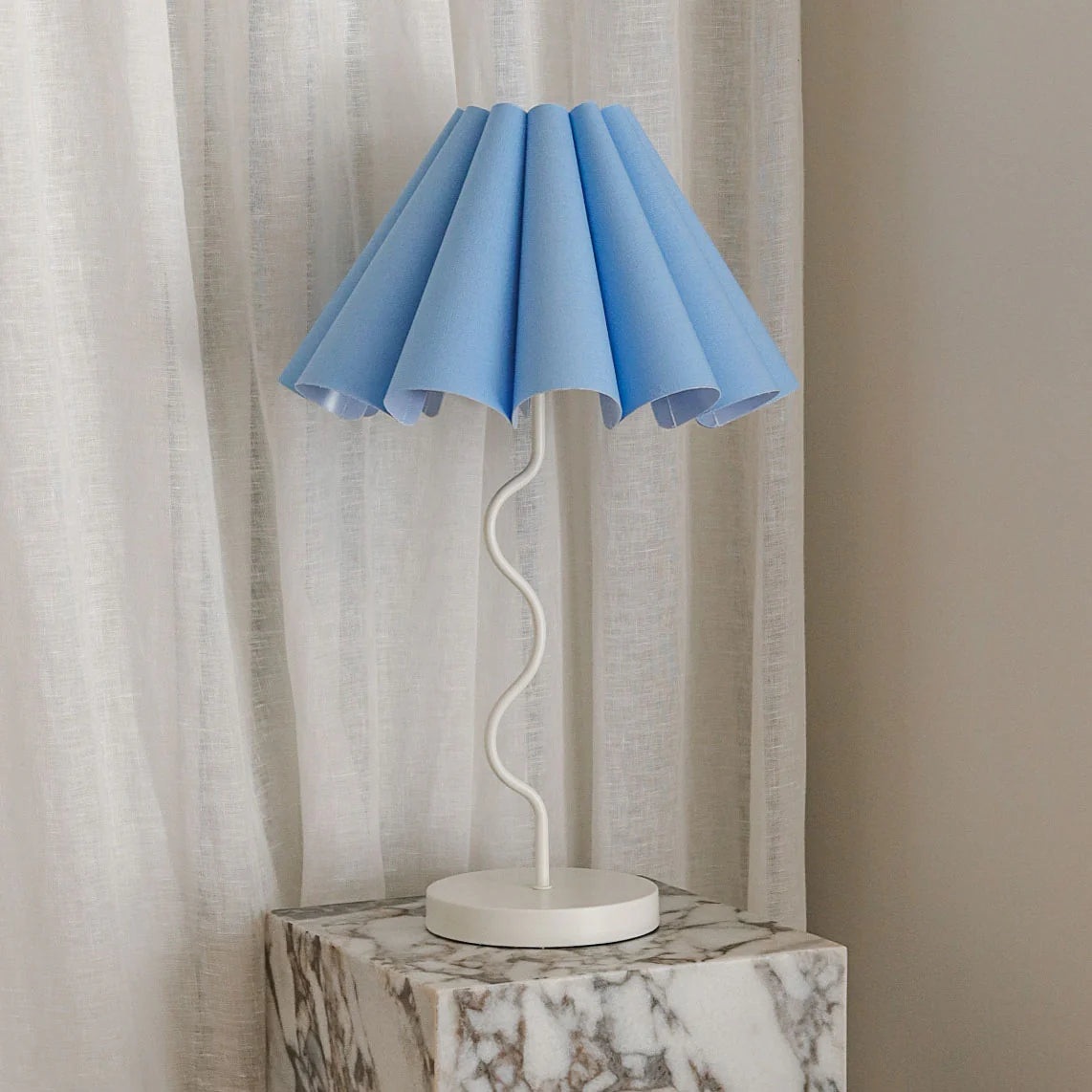 Make a statement on your bedside with our beautiful vintage inspired linen fluted lampshade and brass plated squiggly base.