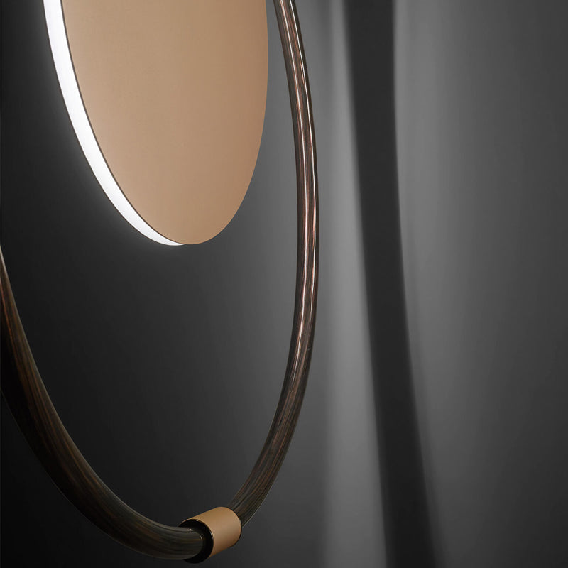 This over-sized, ultra modern pendant light is comprised of a tubular glass circle featuring an Aventurine glass effect. The internal metal disc which doubles as the light source is available with a matte champagne or matte bronze finish.