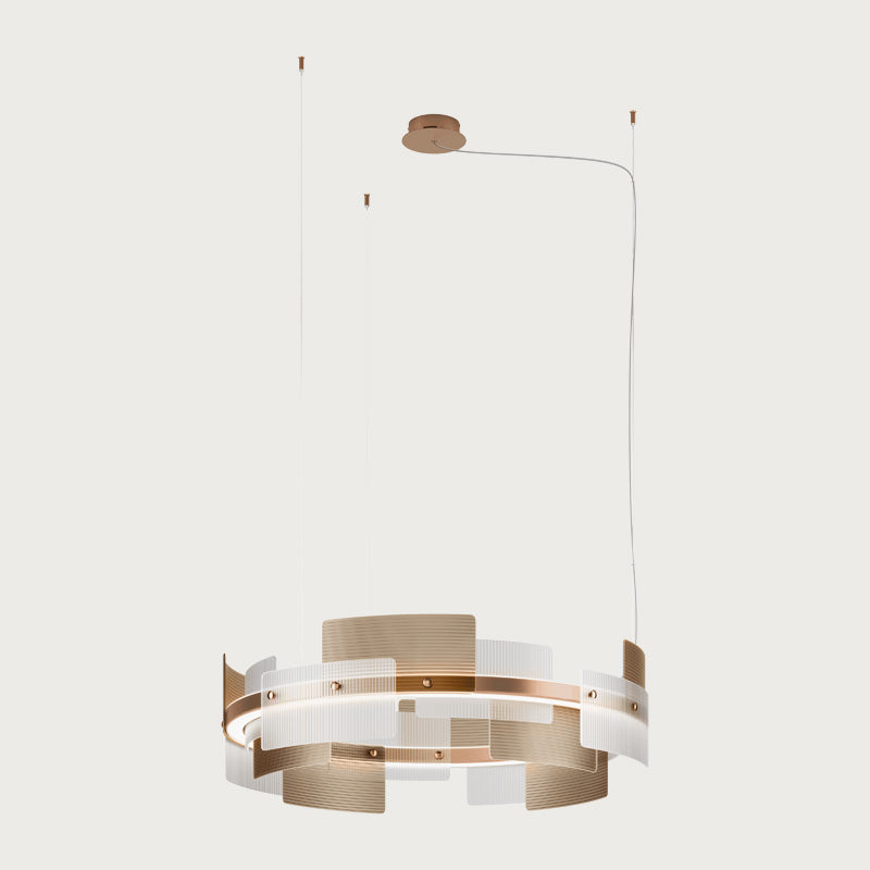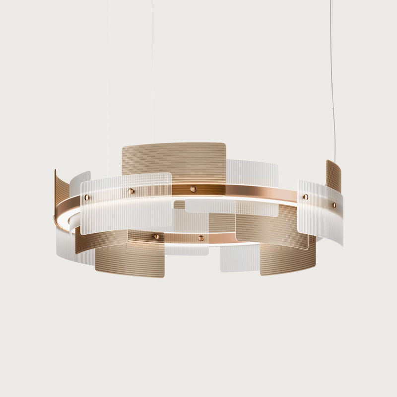 Halo is a suspended metal ring accented with textured, micro-ribbed satin glass plates. Overlapping colours and geometric patterns create a dynamic play of light and shadow—like a modern sculptural artwork.