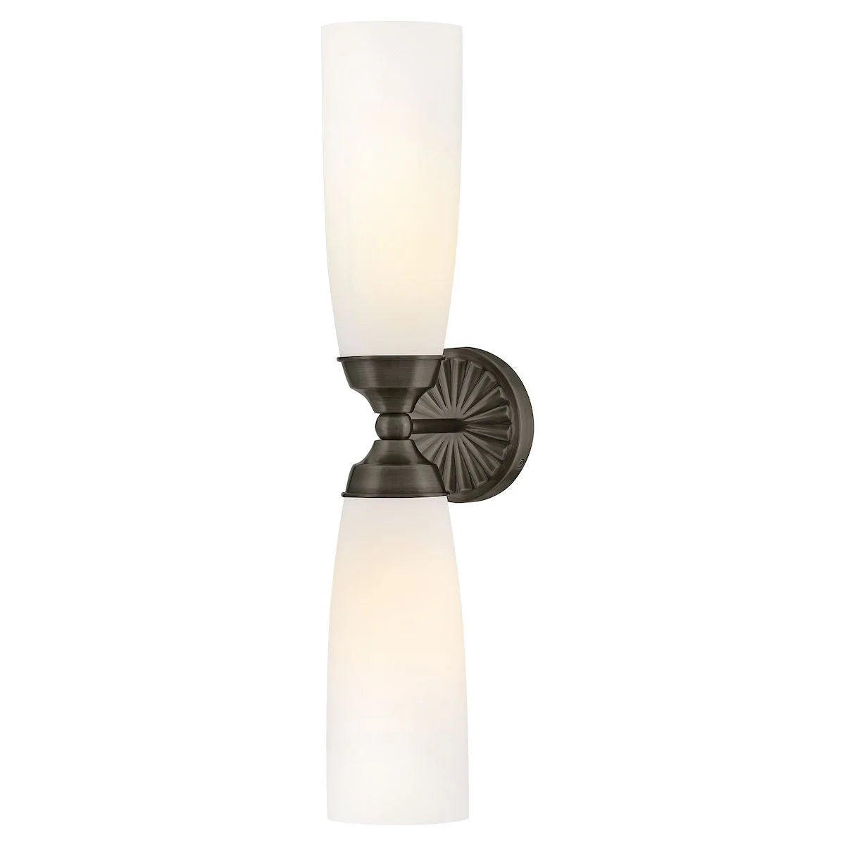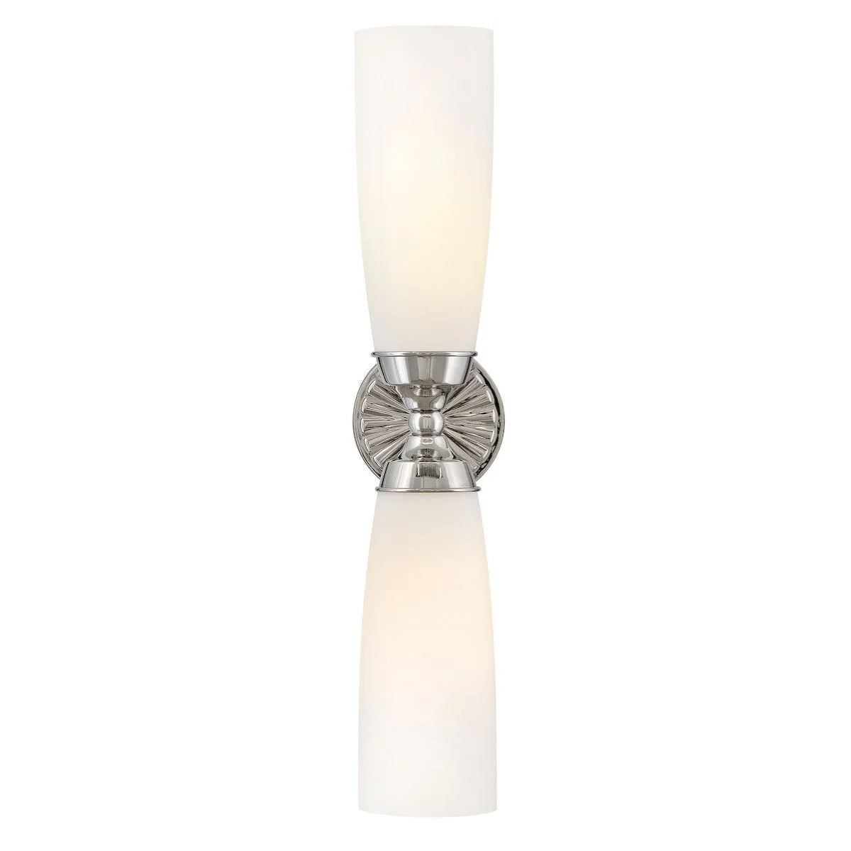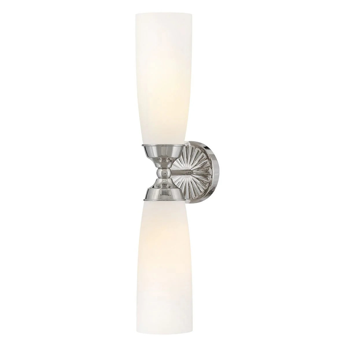 Blending the glamour of art deco design with midcentury style, Alexis showcases refined details elegantly contrasted by elongated, Etched Opal glass shades. A medallion backplate features a sunburst motif enhanced by hand-polished finishes and burnished detailing to create a rich, dimensional look that elevates any space