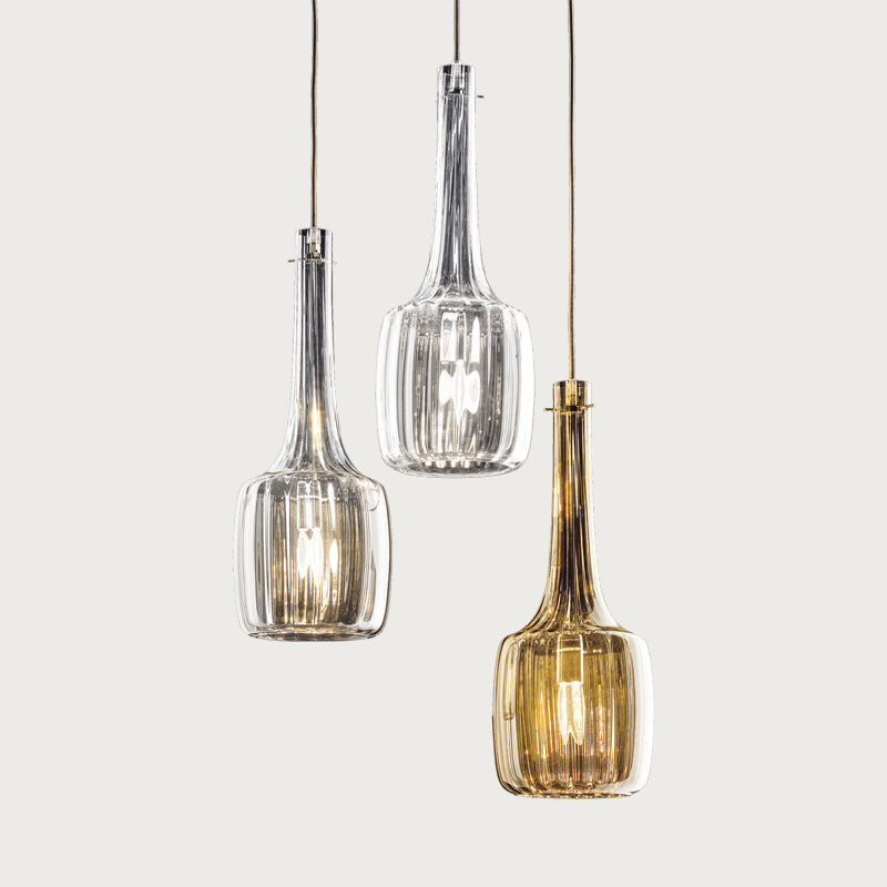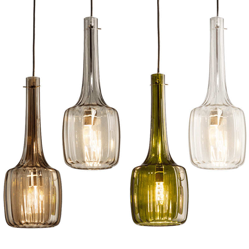 Interior pendant available in four glass finishes and colours: Clear, Smoke, Dove Grey and Olive Green. Metal with iron grey finish and blown glass diffusers.